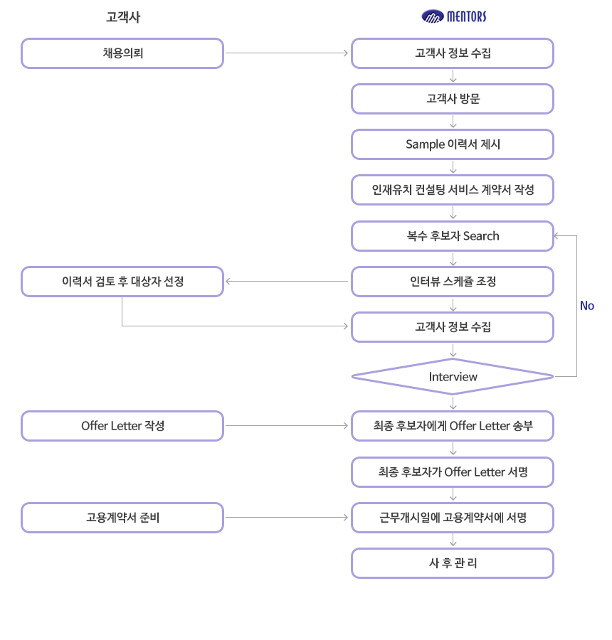 Executive Search 사업부의 분사를 통하여 전문적인 Head Hunting Service를 제공하고 있습니다. Junior Search (사원~대리) 및 Middle Search(과장~부장)에서 Executive Search(임원급)에 이르기까지 전문 HR Consultant로 구성된 맨토스의 Executive Search 서비스는 귀사의 전문분야에 대한 핵심인력 채용에 드는 비용 및 시간을 절약 할 수 있습니다.